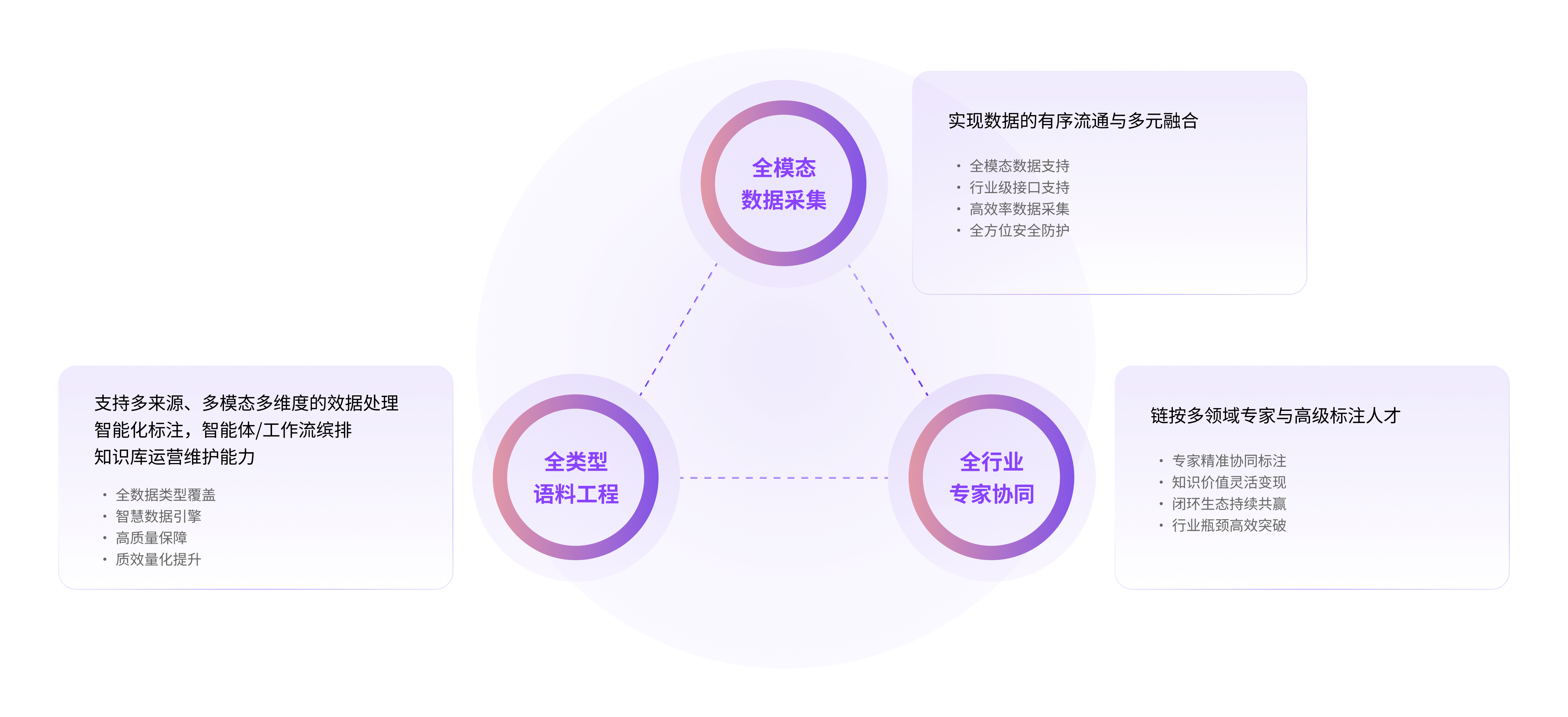 A full-modal data collection platform, an all-category corpus engineering platform, and a cross-industry expert collaboration platform. The synergy of these three platforms builds a new generation of AI data infrastructure, enabling the flow and integration of data, intelligent processing, and the maximization of knowledge value.